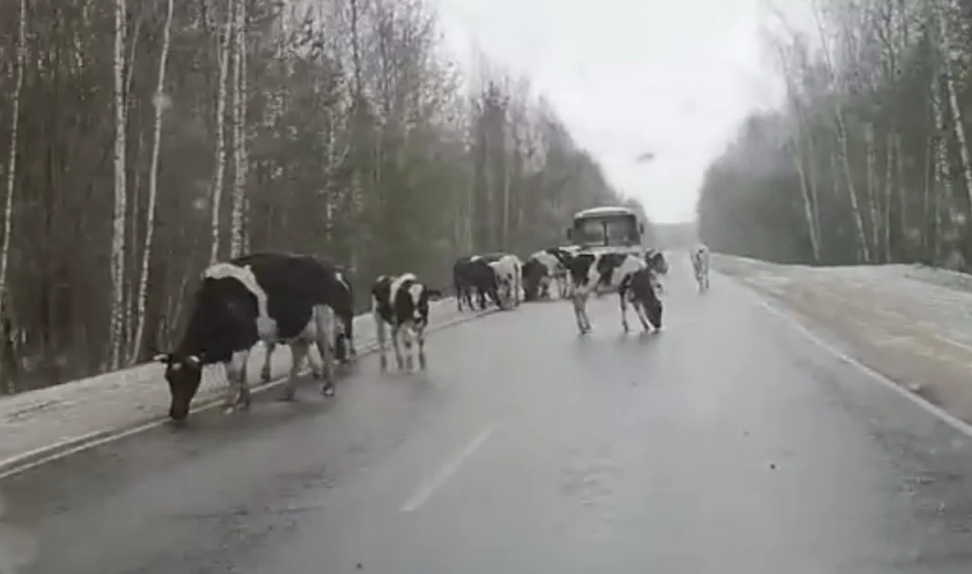 В Касимовском округе Рязанской области попали на видео коровы, вышедшие на дорогу, чтобы полизать асфальт. Запись опубликовал телеграм-канал «Автоклуб Касимов».