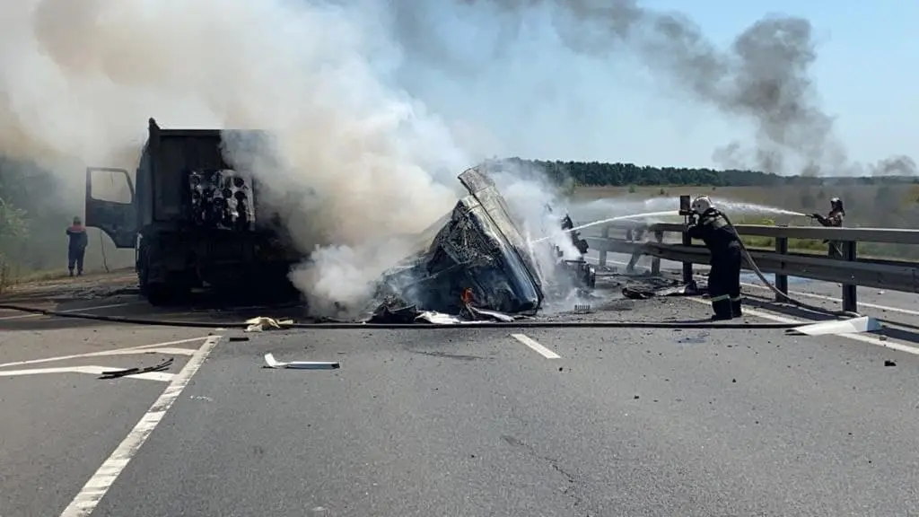 Авария случилась 13 июля в 13.00 на 207-м километре трассы М-5 «Урал» в Рязанском районе. 37-летний водитель автомобиля ДАФ с полуприцепом врезался в самосвал «Вольво» дорожных рабочих. После удара фура загорелась.
