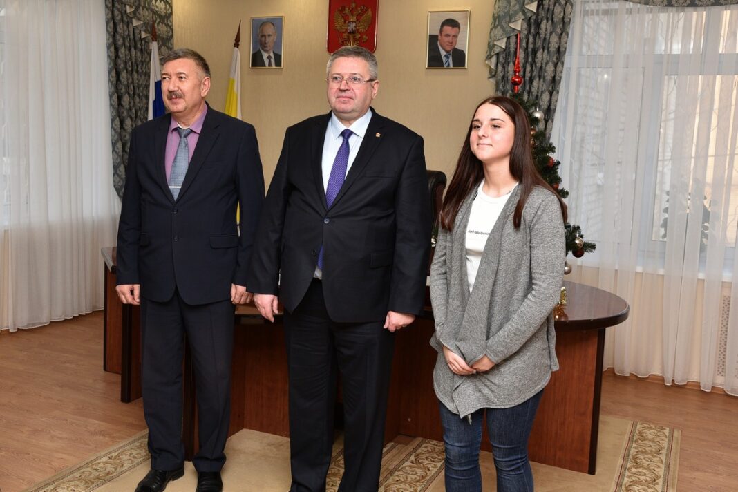 Подарок школьнице передали врио главного федерального инспектора по Рязанской области аппарата полномочного представителя Президента РФ в ЦФО Валерий Савин и министр труда и соцзащиты населения региона Валерий Емец.