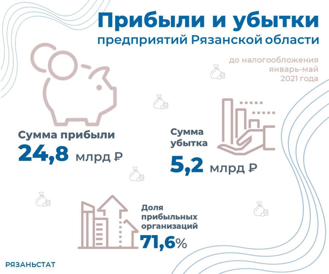 Предприятия Рязанской области с января по май 2021 года увеличили суммарную чистую прибыль на 44,6% по сравнению с прошлым годом. К 1 июня, до уплаты налогов, она составила 19,6 миллиарда рублей. Об этом сообщает Рязаньстат.