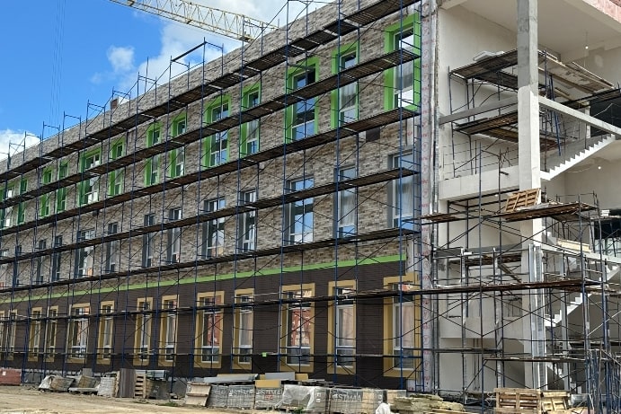 На 100% возведены несущие конструкции стен, колонн, перекрытий и лестничных маршей здания, осуществлена кладка наружных стен, на 80% выполнен монтаж внутренних перегородок.