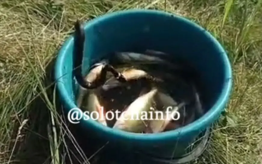 На кадрах видно, как уж подползает к ведру с уловом и нагло вытаскивает одну из рыб. Змея смогла вытащить рыбу спустя несколько попыток.