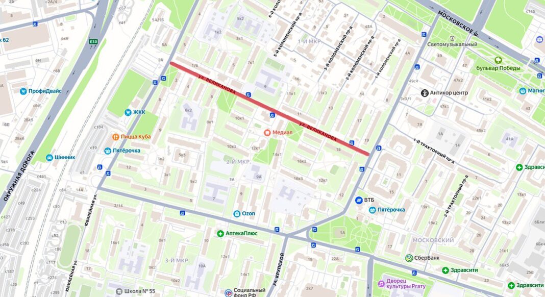 в сторону «ул. Крупской» — Московское шоссе → ул. Юбилейная;