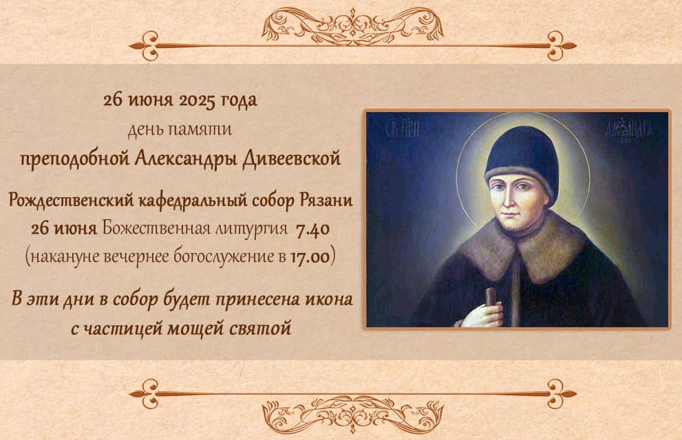 Святыня прибудет в храм к началу вечернего богослужения (в 17:00). Икона останется в главном соборе города и в сам день памяти — 26 июня. Божественную литургию в этот день возглавит митрополит Рязанский и Михайловский Марк. Начало богослужения — в 07:40.