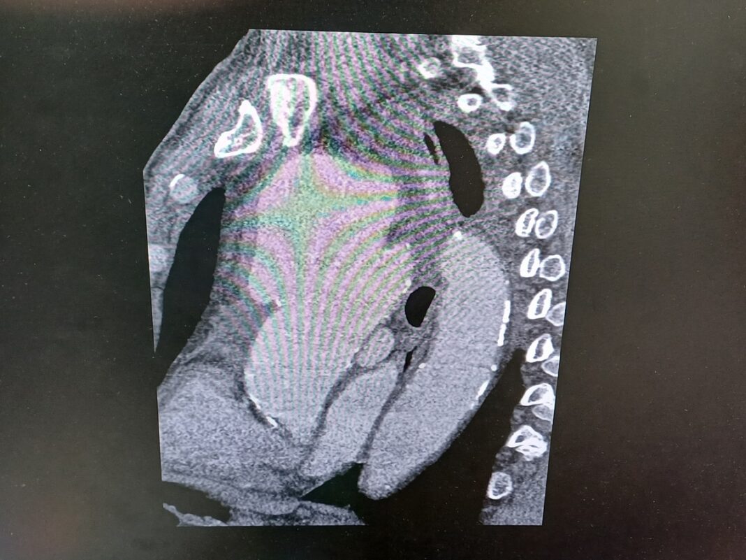 «Компьютерная томограмма подтвердила выпячивание аорты размером 9 на 9 сантиметров. Гигантская мешотчатая аневризма, больше, чем гусиное яйцо. Она сдавливала все близлежащие органы и ткани: трахею, бронхи, верхнюю полую вену. Уникальный случай. Аневризмы таких размеров встречаются не часто», – отмечает заведующий отделением №5 Рязанского кардиодиспансера Сергей Загородний.