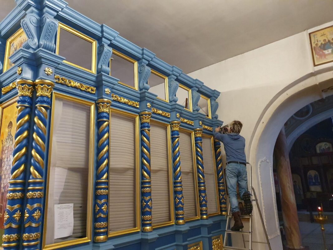 В группе храма в соцсети ВКонтакте сообщили: сейчас идёт установка позолоченного декора на южную сторону иконостаса. Нижние и средние ярусы иконостаса уже полностью позолочены. Осталось позолотить верхний ярус иконостаса и написать недостающие иконы.