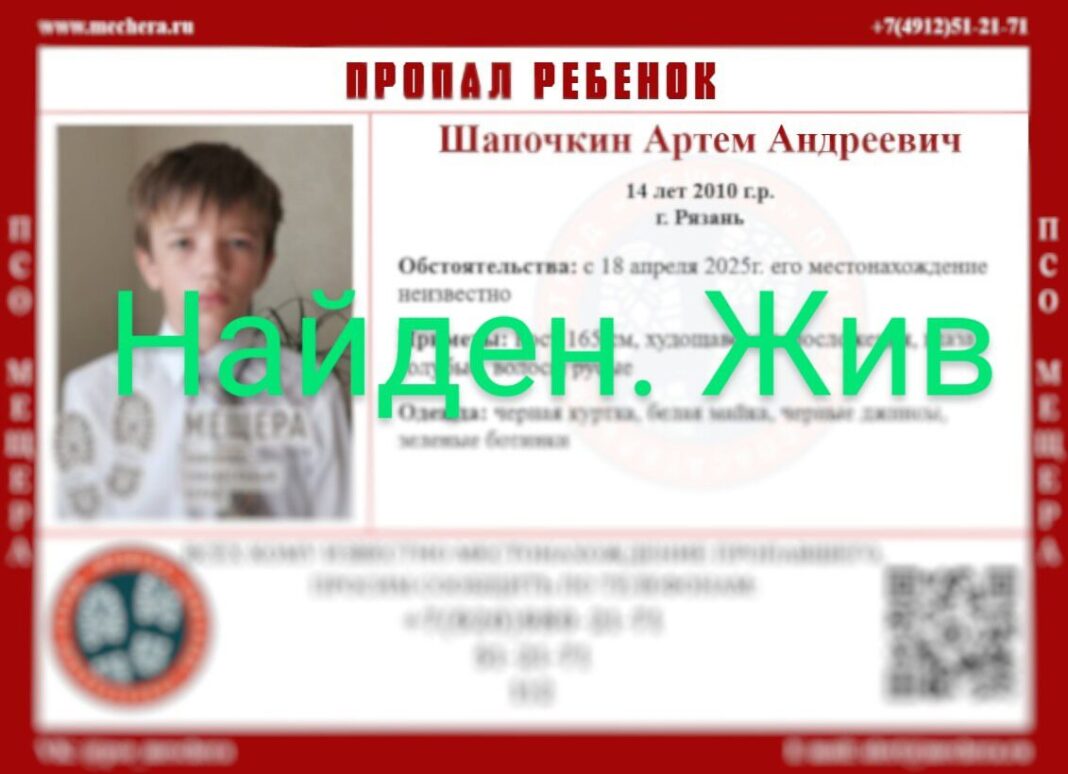 В Рязани найден 14-летний Артём Шапочкин, исчезнувший 18 апреля. Об этом сообщает ПСО «Мещера».