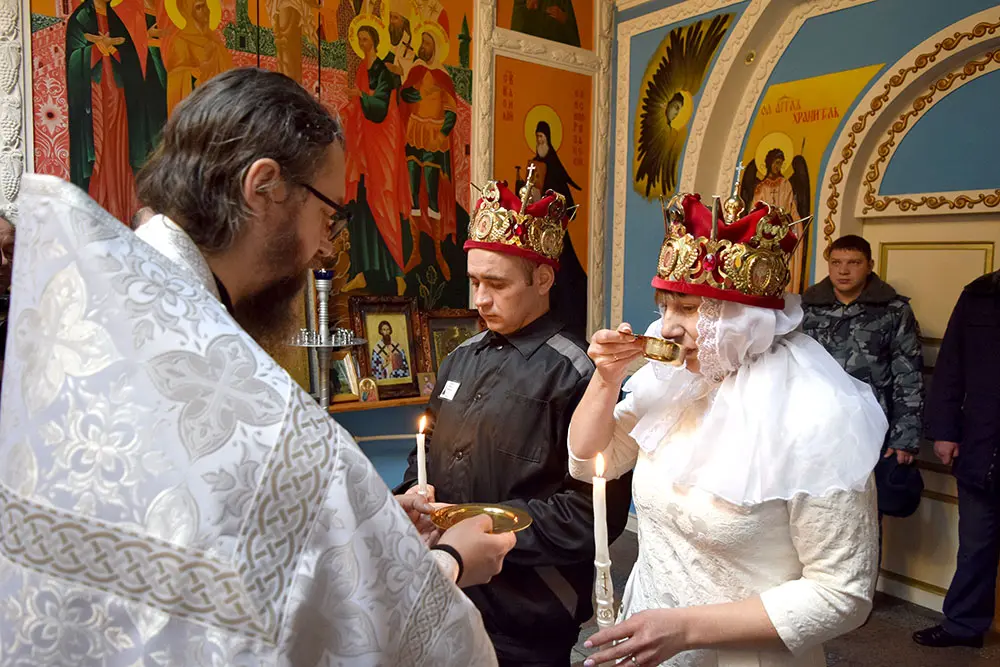 Таинство состоялось в храме Покрова Пресвятой Богородицы, который располагается в ИК-2. Заключённый и его жена решили обвенчаться спустя 13 лет брака. Венчание для них — это обдуманный и давно желанный шаг. Несмотря на то, что отбывать наказание осужденному остается чуть более полугода, супруги не стали ждать и обвенчались в колонии.