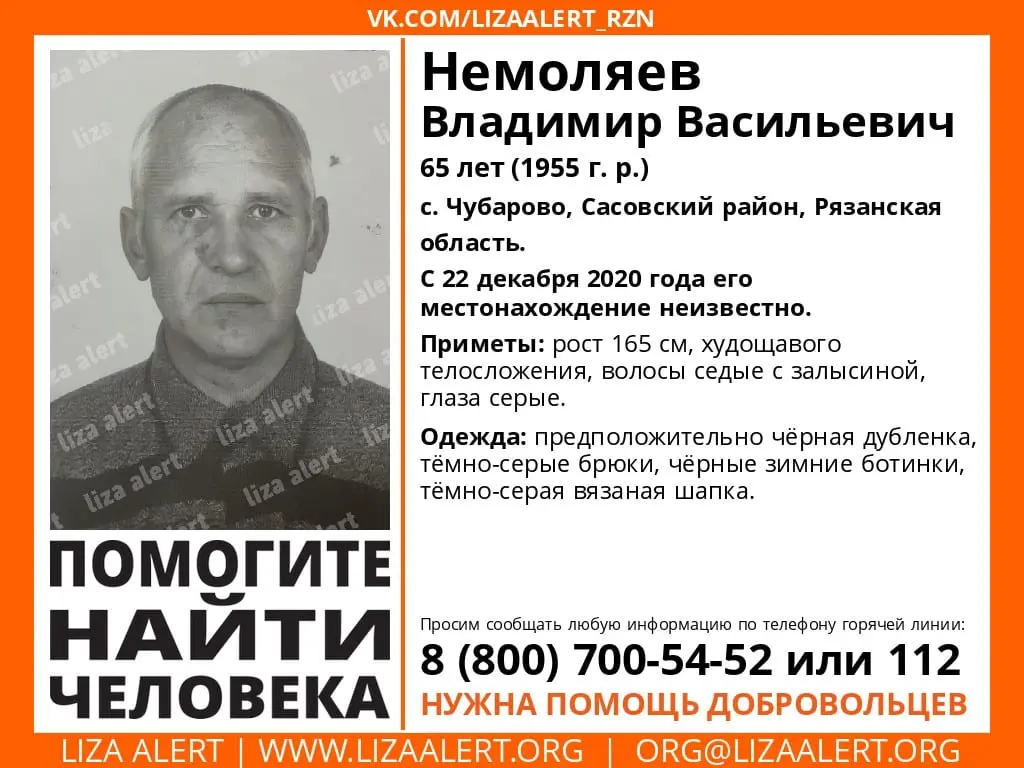 Владимир Васильевич Немоляев пропал 22 декабря 2020 года. 65-летний мужчина проживал в селе Чубарово Сасовского района. С конца декабря и до настоящего времени местонахождение пропавшего неизвестно.
