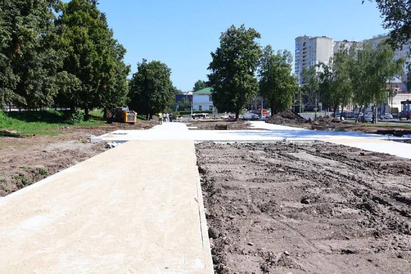На основной части сквера, со стороны стелы, завершается обустройство пешеходных дорожек. Подрядчик приступил к проведению земляных работ. В перспективе — дополнительное озеленение.