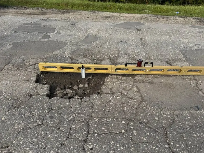 На месте проверки были обнаружены выбоины, размеры которых превышают допустимые нормы, что свидетельствует о несоблюдении государственных стандартов при выполнении ямочного ремонта.